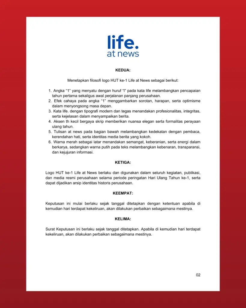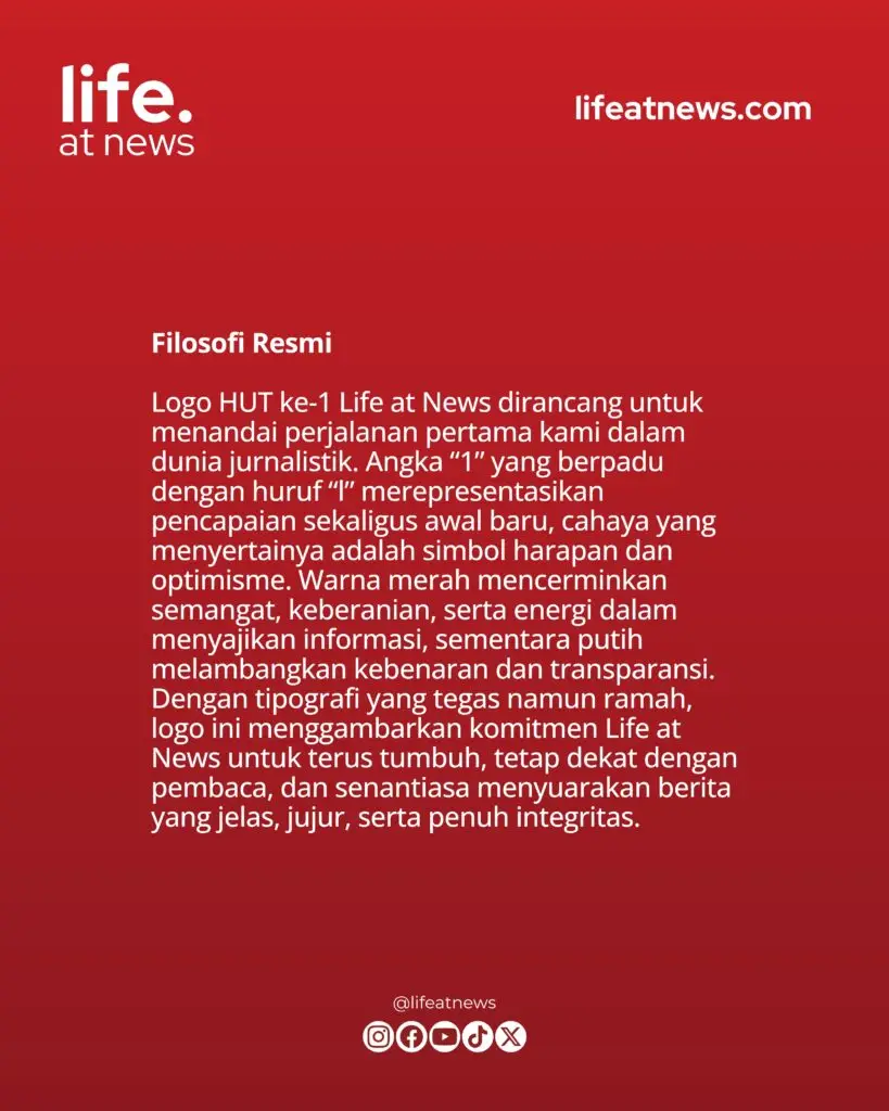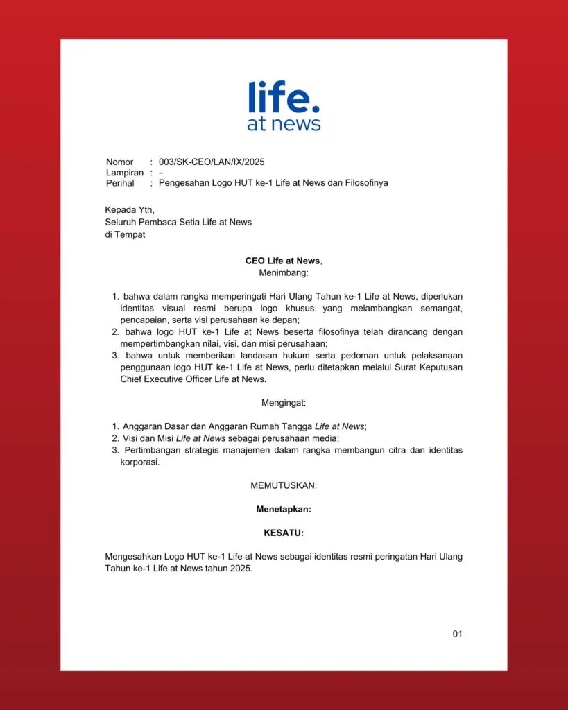 Halo seluruh pembaca setia Life at News, diinformasikan bahwa pada hari ini, Senin, 22 September 2025, sesuai dengan Surat Keputusan yang dikeluarkan oleh CEO Life at News, Giffari Naufal Arisma Putra, Logo HUT ke-1 Life at News beserta filosofinya telah resmi diluncurkan.