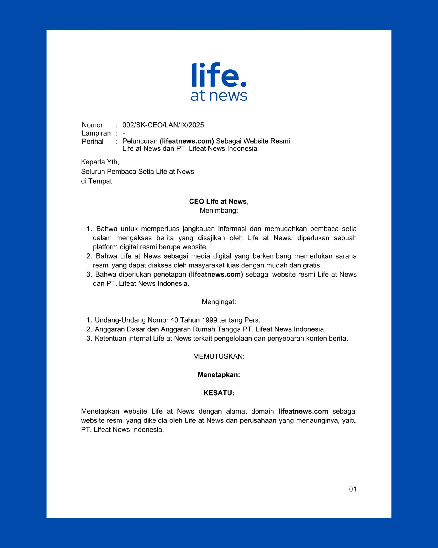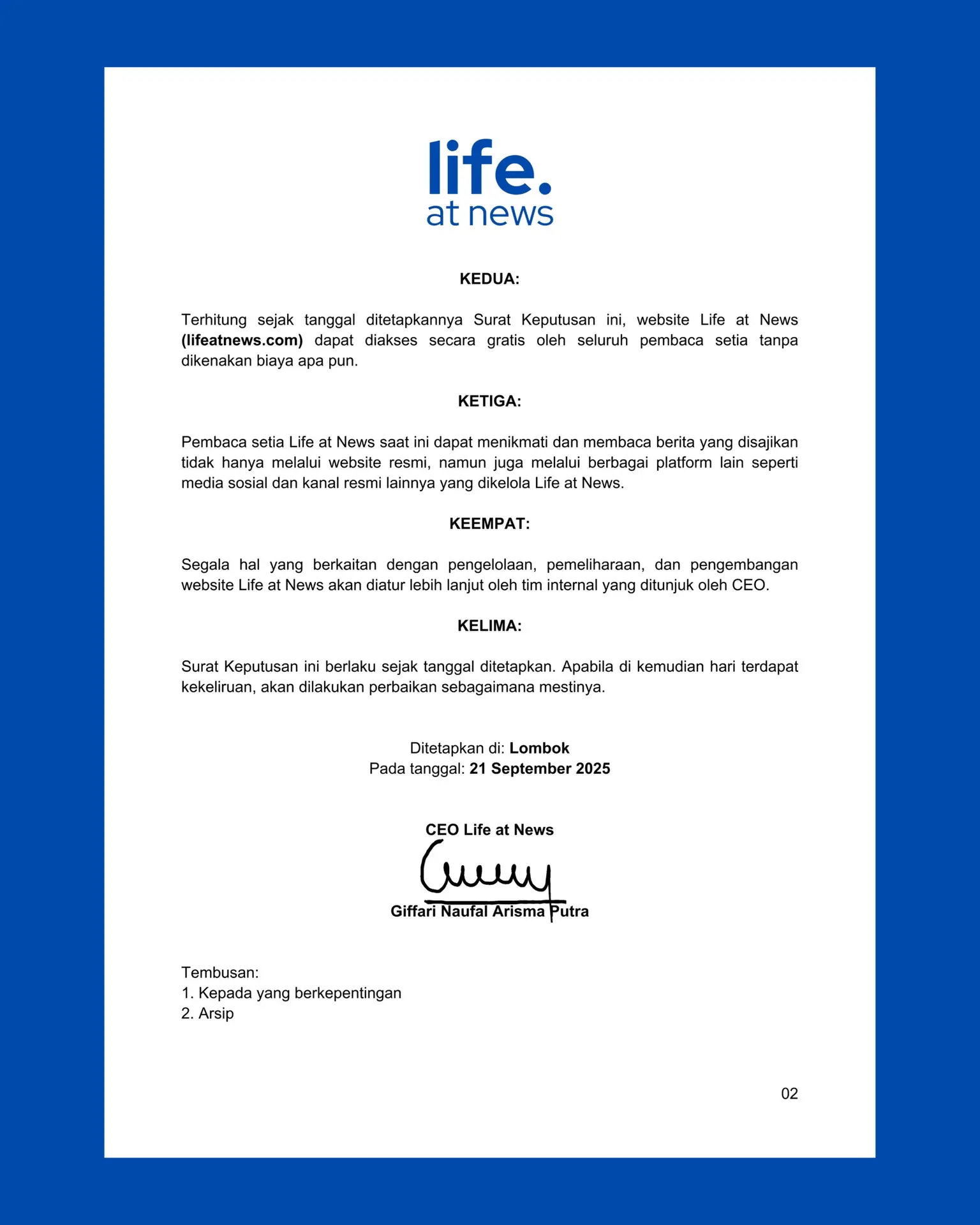 Halo seluruh pembaca setia Life at News, diinformasikan bahwa mulai hari ini, Minggu, 21 September 2025, sesuai dengan Surat Keputusan yang dikeluarkan oleh CEO Life at News, Giffari Naufal Arisma Putra, website resmi Life at News (lifeatnews.com) telah resmi diluncurkan.